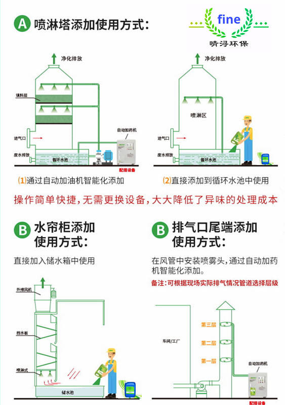 3、喷淋塔处理:在喷淋塔中,根据恶臭气体浓度适当加大除臭剂的投加量(如1-3‰比例),并建议少量多次投加以确保除臭效果喷淋塔能够过滤大量废气,并通过循环水与除臭剂的接触,有效分解恶臭分子 应用领域水帘柜循环水除臭剂广泛应用于各类喷涂工艺的污水处理领域,如汽车制造(车身喷涂、零部件喷涂等)、家具生产、金属加工(各种金属表面涂层处理等)等。