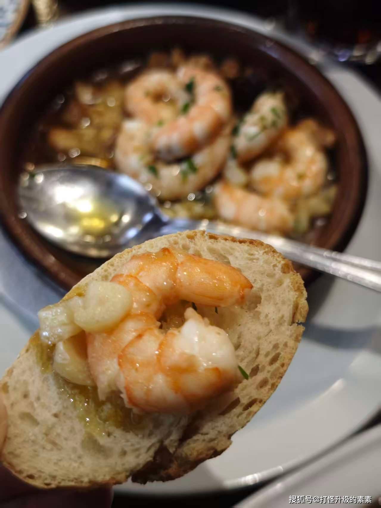 蒜油虾的官方搭配是法棍切片,一勺橄榄油混合着熟蒜和弹牙的大虾,香迷糊了。